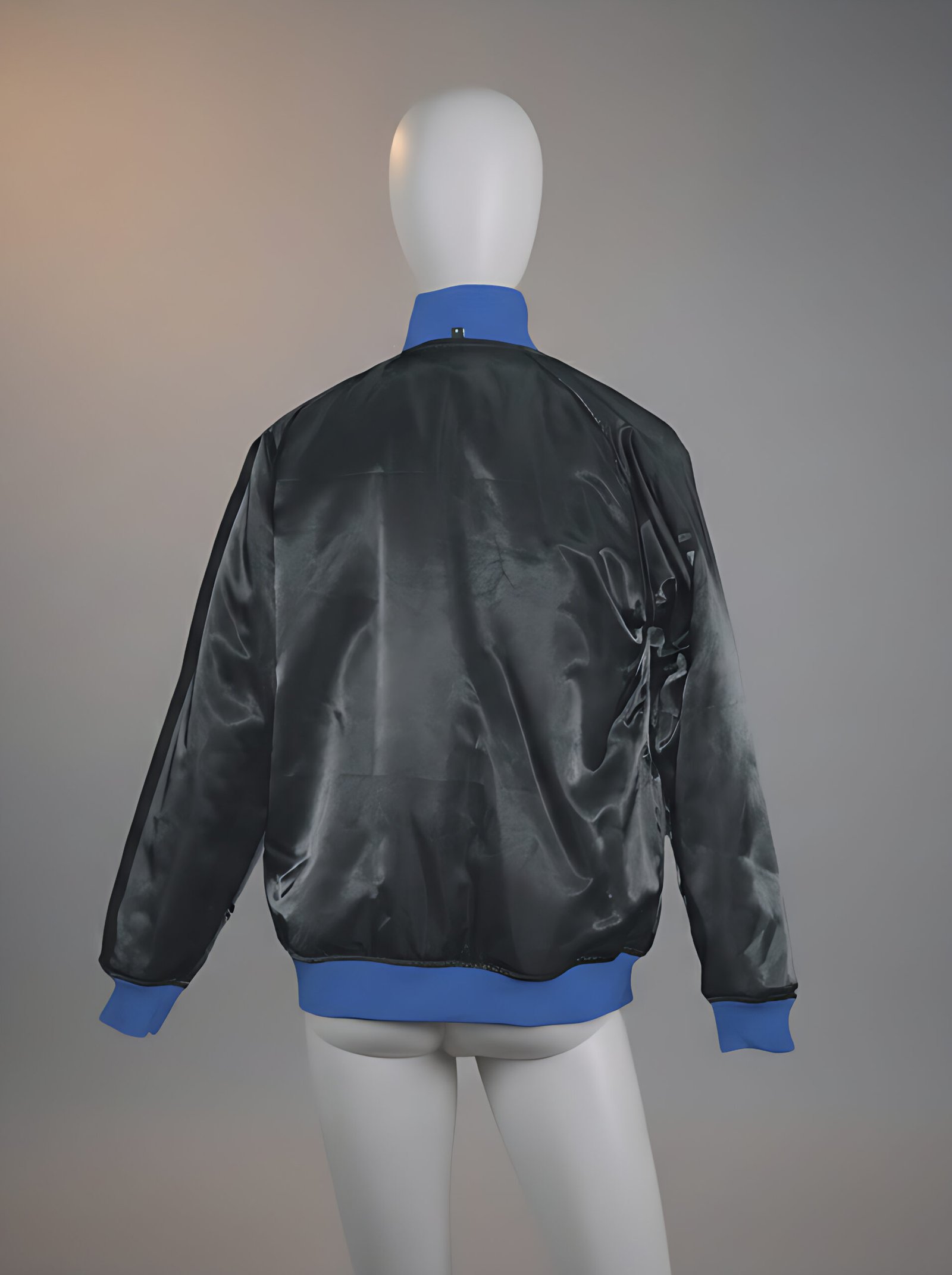 Fabric: Constructed from a high-quality Black Satin-Finish Fabric (e.g., Polyester Satin). This fabric provides a luxurious sheen and a smooth hand-feel, elevating the jacket from casual wear to a statement piece.