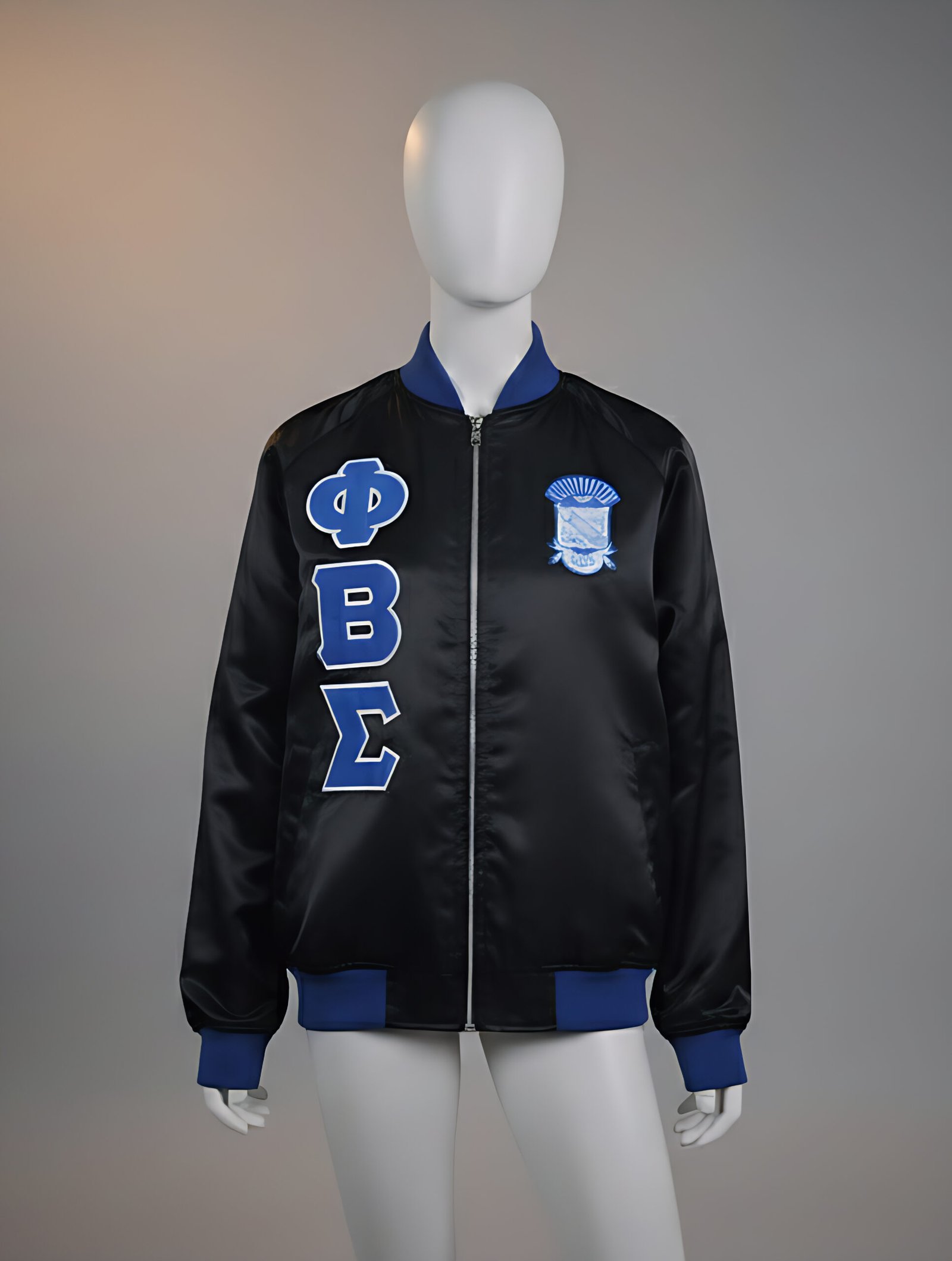 D9 Greek Wear proudly presents the Midnight Bomber Jacket, a sleek and striking piece designed to showcase the pride and prestige of Phi Beta Sigma Fraternity, Inc. This jacket offers a sophisticated, classic aesthetic, making it an essential addition to any fraternity member’s wardrobe.