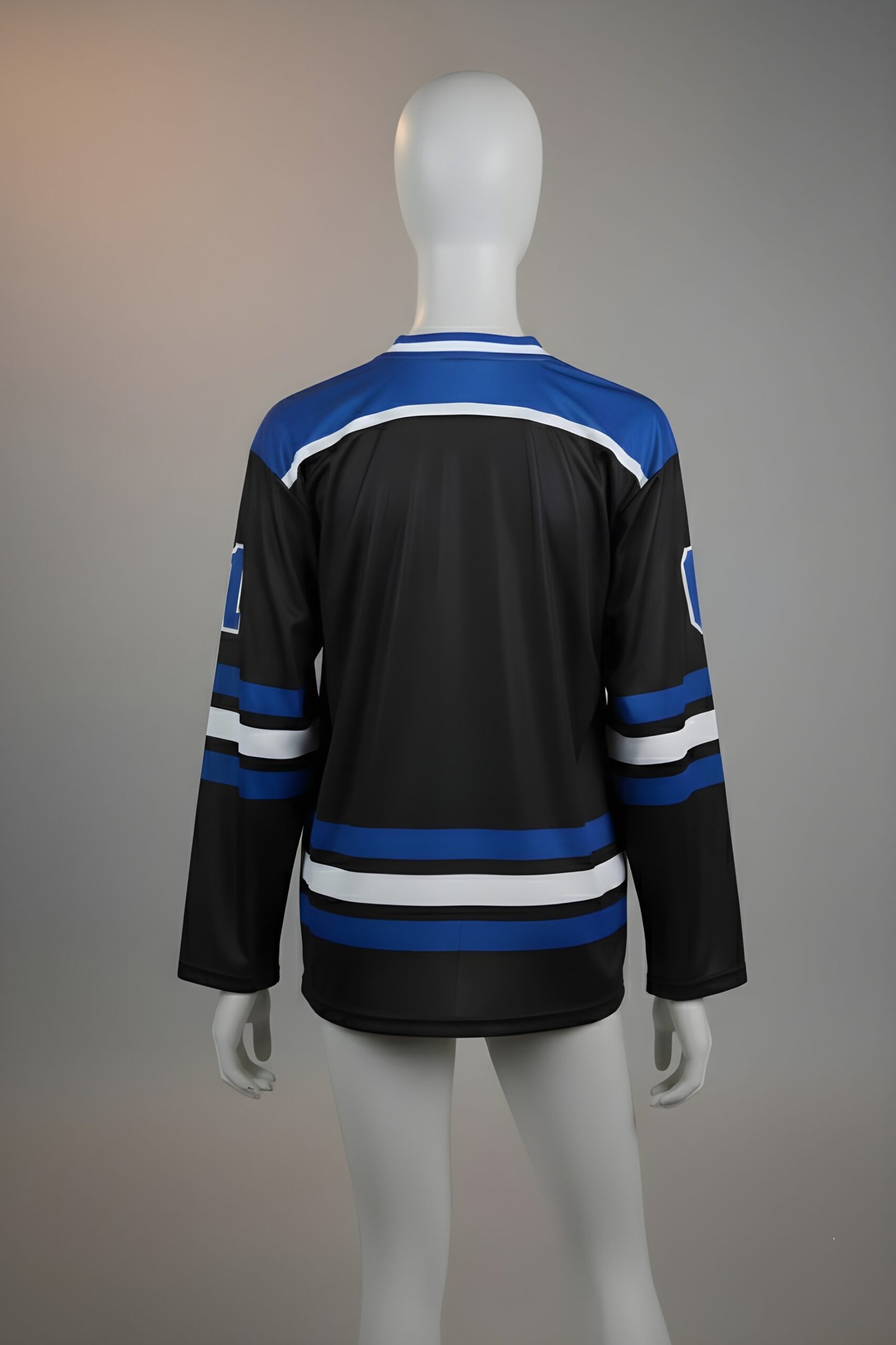 Striping Details: The sleeves and hem feature bold, multi-layered Royal Blue and White athletic stripes, adding a classic “on-ice” professional look.